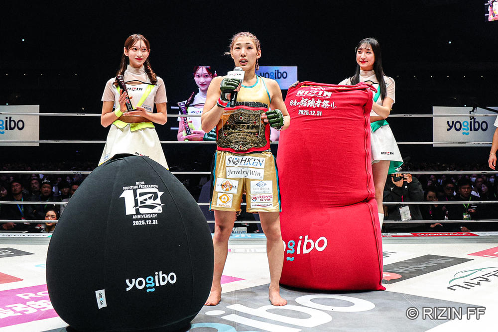 2025年12月31日(水)さいたまスーパーアリーナで開催された『RIZIN師走の超強者祭り』にて、第10試合のRIZINスーパーアトム級(49.0kg)選手権試合5分3Rで挑戦者のRENA(SHOOTBOXING/シーザージム)に2R1分58秒、ギロチンチョークで勝利した王者・伊澤星花(Roys GYM/JAPAN TOP TEAM)が試合後インタビューに答えた。