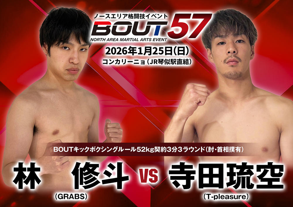 2026年1月25日(日)北海道・札幌のコンカリーニョ(JR琴似駅直結)にて開催されるノースエリア格闘技イベント『BOUT 57』の全対戦カードが決定した。