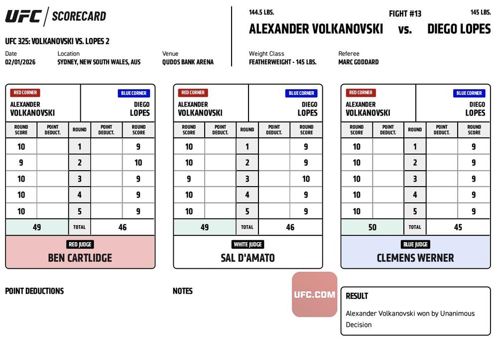 2026年1月31日(日本時間2月1日朝7時)、豪州シドニー クドス・バンク・アリーナにて『UFC 325: Volkanovski vs. Lopes 2』(U-NEXT/UFC Fight Pass 配信)が開催されている。