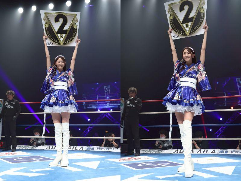 【K-1】ミニ丈の着物風衣装でラウンドガールがリング上で前方・後方へしなやかに一回転「体操の特待生として入ってキャプテンもやりました」K-1公式ヴィーナス・斎藤恭代が鮮やかパフォーマンス