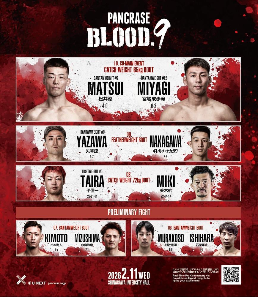 2026年2月11日(水/祝)『PANCRASE BLOOD.9』品川インターシティホール大会のメインカードの第11試合で行われる予定だった葛西和希(マッハ道場/11勝5敗)vs.西尾真輔(宇留野道場/6勝5敗)など、下記4試合が前日計量の結果、中止となった。