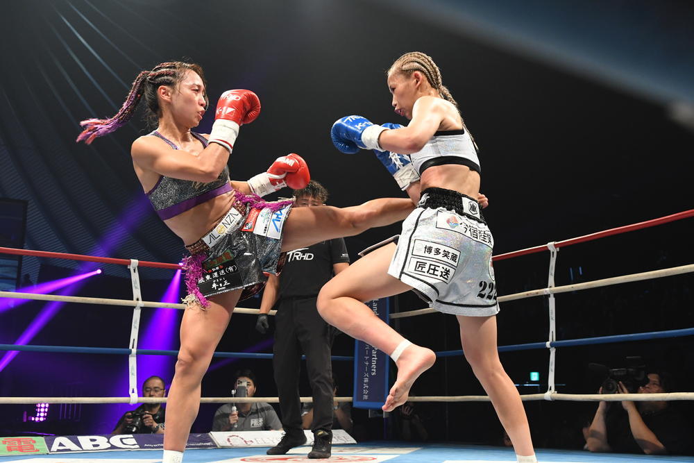 第6試合のK-1 WORLD GP女子アトム級タイトルマッチ3分3R延長1Rで、2度目の防衛戦に臨んだ松谷綺(ALONZA ABLAZE)は、ベロニカ・ロドリゲス(メキシコ)に3R終盤に右フックでダウンを奪われ、判定3-0(30-28×3)で敗れ