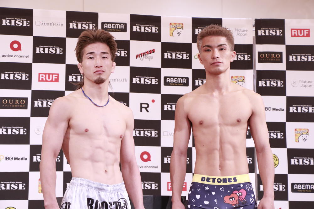 2026年2月23日(月・祝)東京・後楽園ホール『RISE196 -RISE 23rd Memorial event-』の前日計量&記者会見が、22日(日)都内にて14:00より行われた。  セミファイナル(第10試合)のフェザー級(-57.5kg)王座次期挑戦者決定戦3分3R延長1Rで対戦する、同級3位・梅井泰成(Mouton)は57.5kg、同級4位・大森隆之介(EX ARES)は57.45