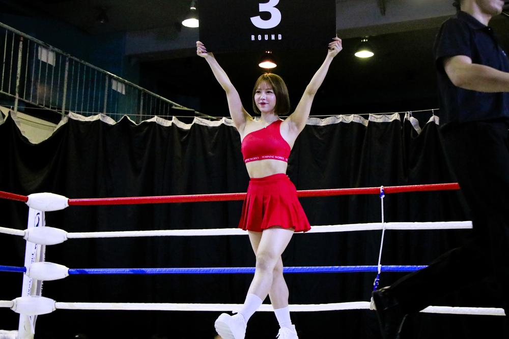 全19試合、総勢38名の女子キックボクサーが登場した今大会を、選手と一緒に盛り上げた赤いコスチュームが印象的なラウンドガール2名。ラウンドガールというと、レースクイーンのような細身のモデル体型が一般的だが、この日登場した2