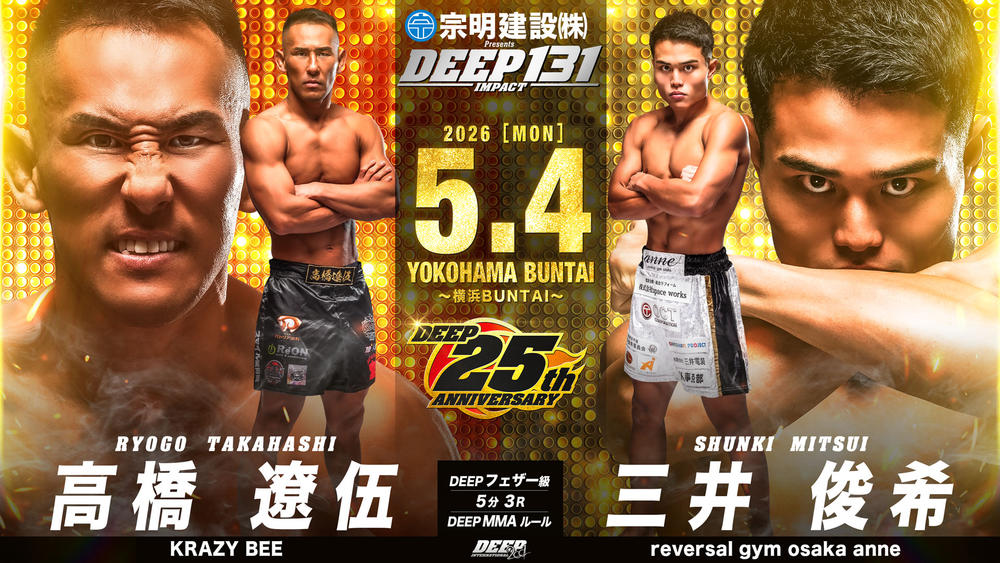 2001年8月18日の『DEEP2001 in YOKOHAMA(DEEP 2)』以来、25年ぶりのDEEP横浜BUNTAI大会となる『宗明建設Presents DEEP 131 IMPACT』(5月4日)の一部対戦カードが13日、発表された。 ▼DEEPバンタム級暫定王座決定戦 5分3R平松 翔(THE BLACK BELT JAPAN)鹿志村仁之介(Battle-Box)   DEEPバン