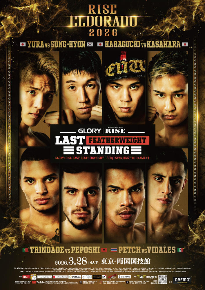 2026年3月28日(土)東京・両国国技館『RISE ELDORADO 2026』(ABEMA PPVでLIVE配信)の全対戦カード&試合順が決定した。  メインイベント(第12試合)は、RISE世界バンタム級(-55kg)タイトルを懸けて王者・志朗(BeWLLキックボクシングジム)と挑戦者・大﨑孔稀(OISHI GYM)が約4年ぶりの再戦。  セミファイナル(第11試合)は、第4代RISEスー