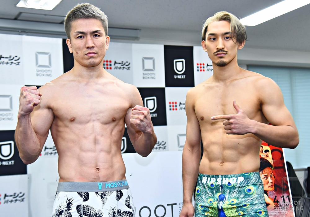 2026年4月11日(土)東京・後楽園ホール『SHOOT BOXING 2026 act.2』(U-NEXT配信)の前日計量が、10日(金)都内にて17:00より行われた。  メインイベントの58.0kg契約ノンタイトルマッチで対戦するSB日本フェザー級王者・山田彪太朗(シーザージム)と同級4位・魁斗(立志會館)は共に58.0kgジャストで計量をパスし、あとは試合のゴングを待つのみとなった。