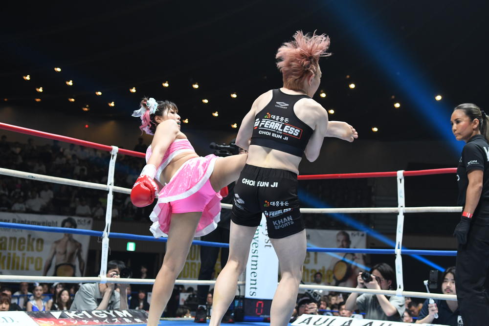 今大会で最も注目を集めた選手の一人である木村萌那(K-1ジム目黒TEAM TIGER)。試合では、KINGレイナと戦ったこともあるチェ・ウンジ(韓国/大邱FEARLESS GYM)を春麗の“百裂脚”こともな蹴り、アマチュアボクシング日本代表にも選ばれた左ストレートで圧倒して勝利。プロ無敗の