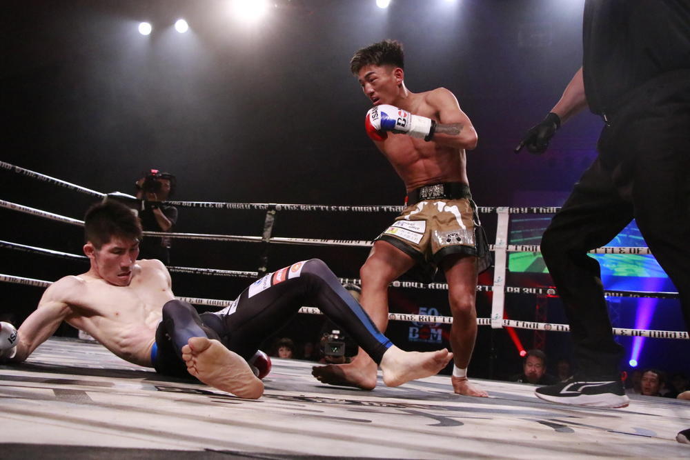 【写真】1Rにダウンを奪った黒田の負傷判定勝ちとなった 同試合は1Rに黒田がヒザでダウンを奪い、2Rに勢いよく飛