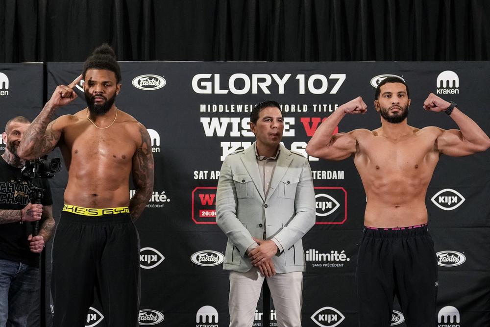 2026年4月25日(土)オランダ・ロッテルダムのRTMステージで開催される『GLORY 107』の前日計量が、24日(金)アムステルダムで行われた。全選手が規定体重をクリア。  メインイベントを飾るドノバン・ウィッセ(スリナム)とチコ・クワジ(オランダ)による「王者vs.王者」の対戦が成立した。  最近アレックス・ペレイラのタイトル最多防衛記録を更新したウィッセは、GLORYミドル級世界王者と