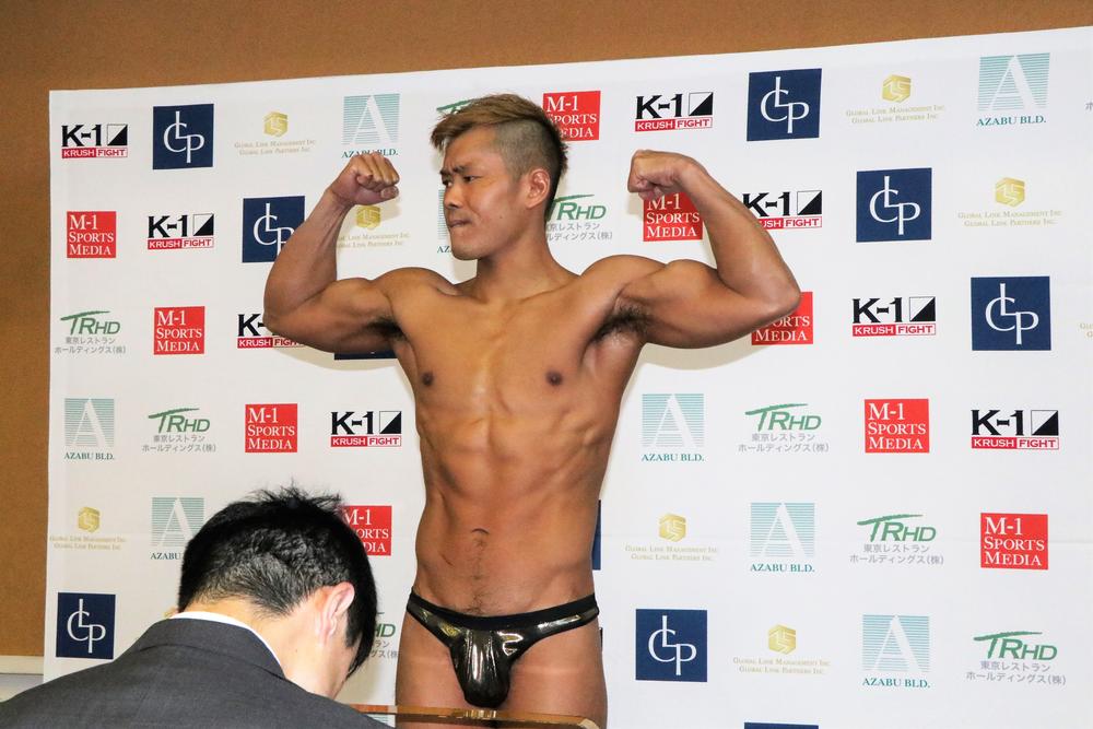 2019年4月19日(金)東京・後楽園ホール『K-1 KRUSH FIGHT.100』の前日計量&公開練習が、18日(木)都内にて行われた。  第6試合のウェルター級3分3R・延長1Rで対戦する、山際和希(谷山ジム)は67.4kg、大泉翔(昇龍會)は67.1kgでウェルター級リミットの67.5kgをパスした。  大泉は元プロボクサーで、2014年西日本スーパーライト級新人王で、10戦5勝(2KO