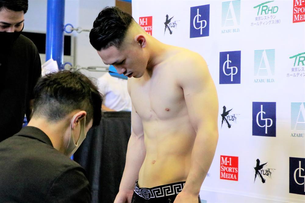 (写真)再計量でもパスできなかった吉岡 メインイベント(第8試合)の「第7代Krushスーパー・バンタム級王座決定トーナメント」1回戦3分3R延長1Rで対戦する、璃明武(=りあむ/K-1ジム総本部チームペガサス)は54.9kgでパスするも、第6代Krushバンタ