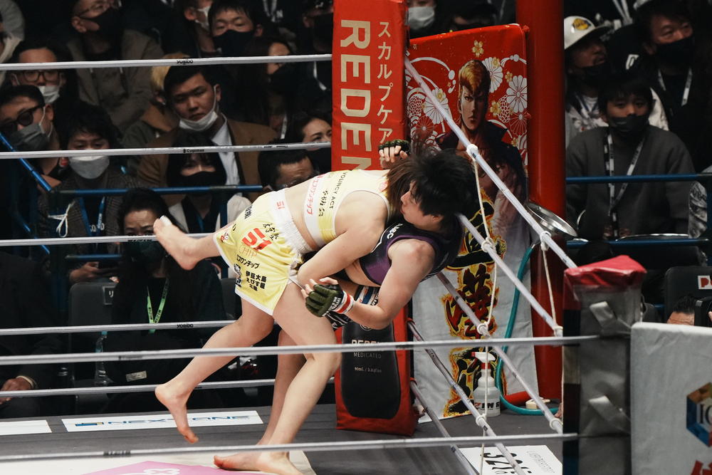 2021年12月31日(金)さいたまスーパーアリーナにて開催された『Yogibo presents RIZIN.33』で、RIZIN女子スーパーアトム級王者・浜崎朱加(AACC)を2R2分50秒、TKOで破る大番狂わせを起こした伊澤星花(フリー)。