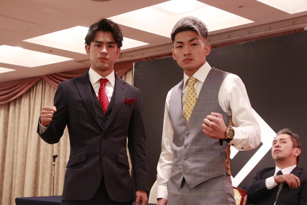 2022年9月23日(金・祝)東京・後楽園ホール『KNOCK OUT 2022 vol.5』の前日計量&記者会見が、22日(木)都内にて正午より行われた。  ダブルメインイベント第1試合にて、第2代KNOCK OUT-REDフェザー級王座決定戦3分5R延長1Rで対戦する、小笠原瑛作(クロスポイント吉祥寺)は57.4kg、TAKERU(GET OVER)は57.3kgで計量をパス。  続いての会見