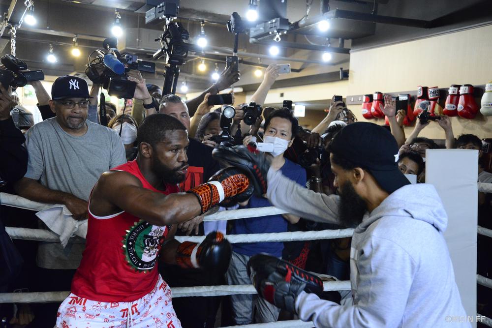 約1時間遅れに始まった公開練習で、あらかじめ型どられたバンテージ、リーボックのリングシューズ、グラント製の特注グローブを着用したメイウェザーは、ミット打ちでショートパンチを連打。ときおり自らミット持ちをサウスポー構えにさせて、左右のコンビネーション、そして右の強打を打ち込んだ。