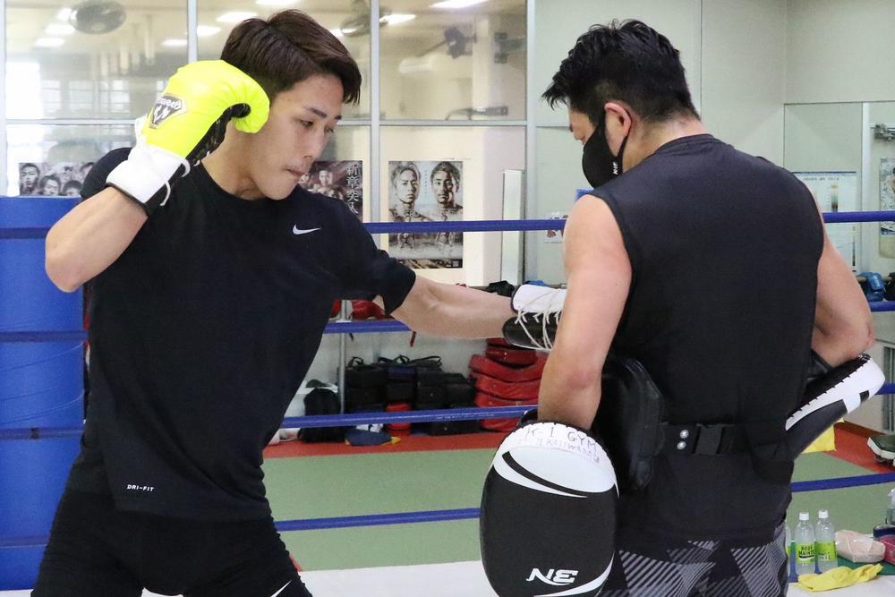 リラックスした表情でジムに姿を現した瓦田は、梶原龍児代表が持つミットへパンチ、キック、ヒザとバリエー