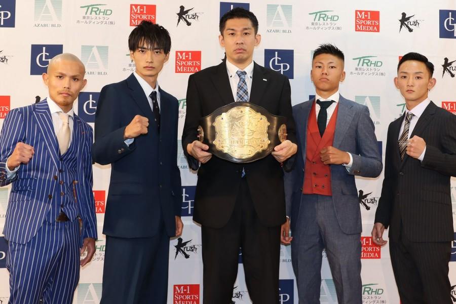 新設された最軽量級、フライ級(-51kg)の初代Krush王座を決めるトーナメントに出場する大久保琉唯(K-1ジム・ウルフ TEAM ASTER)、西林翔平(K-1ジム福岡チームbeginning)、大夢(WIZARDキックボクシングジム)、天馬(WSRフェア