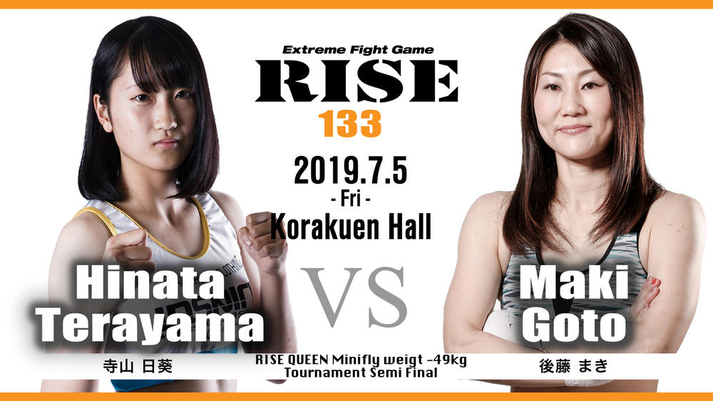 2019年7月5日(日)東京・後楽園ホール『RISE 133』から開幕するRISE QUEENミニフライ級(-49kg)王座決定トーナメント。準決勝(1回戦)で対戦するのはJ-GIRLSミニフライ級王者・寺山日葵(TEAM TEPPEN)とNJKFミネルヴァ・ライトフライ級5位・後藤まき (RIKIX)。