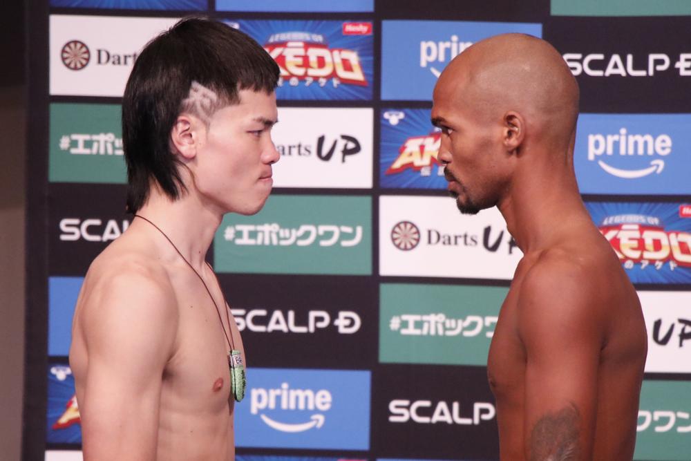 セミファイナルのバンタム級3分10Rで対戦する那須川天心(帝拳ジム/WBC同級1位、WBA2位、WBO2位、IBF4位)は100グラムアンダーの53.4kg、ビクトル・サンティリャン(ドミニカ共和国/WBA同級6位)はリミットちょうどの53.5kg