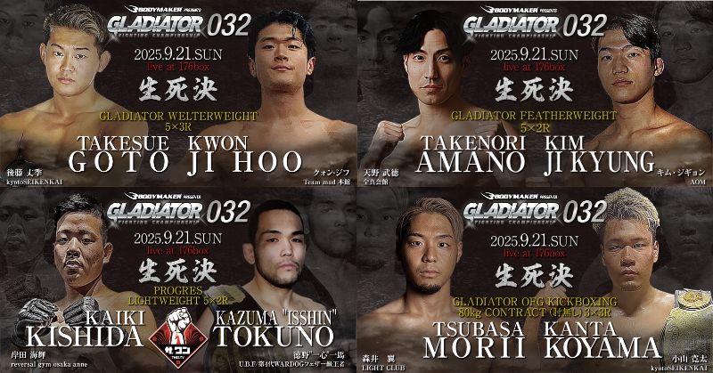 2025年9月21日(日)に大阪府豊中市176BOXで開催される『GLADIATOR 032』の追加カード「国際戦+PROGRESルール」が発表された。  4連勝中の後藤丈季が初の国際戦で韓国のクォン・ジフと対戦。また、抑えられない武道愛・天野武徳がキム・ジギョンとデビュー戦対決に臨む。 ▼GLADIATORウェルター級 5分3R後藤丈季(kyotoSEIKENKAI)クォン・ジフ(TEAM M