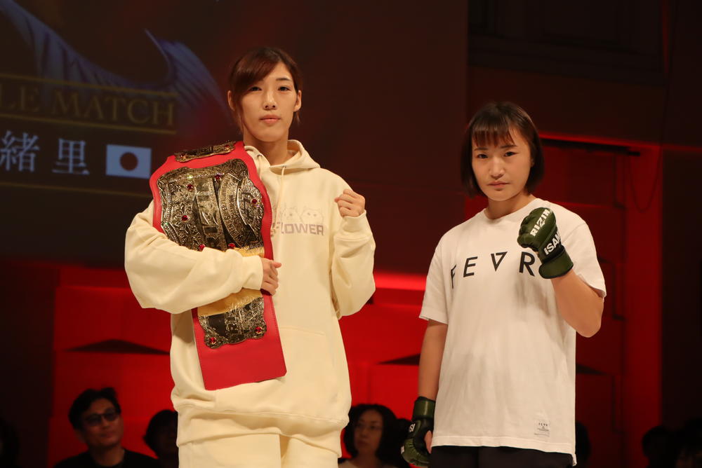 RIZINスーパーアトム級(49.0kg)タイトルマッチ5分3Rで対戦する、伊澤星花(Roys GYM/JAPAN TOP TEAM)と大島沙緒里(リバーサルジム新宿 Me,We)が登場。