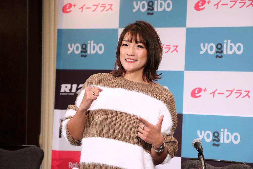 第10試合のRIZINスーパーアトム級(49.0kg)タイトルマッチ5分3Rで、王者・伊澤星花(Roys GYM/JAPAN TOP TEAM)に挑戦するRENA(SHOOTBOXING/シーザージム)が出席。試合への意気込みを語った。