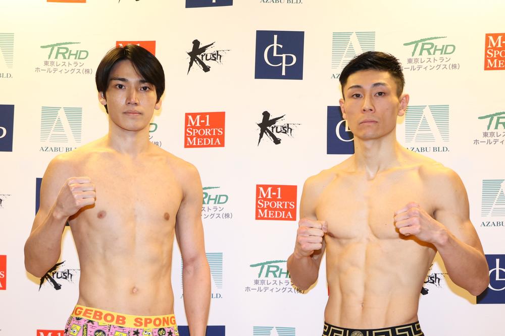 メインイベント(第10試合)のKrushフェザー級3分3R延長1Rで対戦する、新美貴士(名古屋JKファクトリー)はリミットちょうどの57.5kg、松本海翔(TAD)は57.4kgでパス。