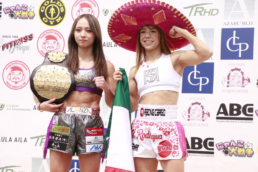 第6試合のK-1 WORLD GP女子アトム級(-45.0kg)タイトルマッチ3分3R延長1Rで対戦する、王者・松谷綺(ALONZA ABLAZE)は44.7kg、挑戦者ベロニカ・ロドリゲス(メキシコ