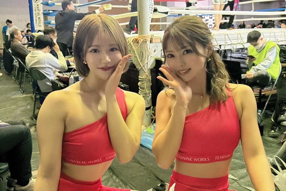 全19試合、総勢38名の女子キックボクサーが登場した今大会を、選手と一緒に盛り上げた赤いコスチュームが印象的なラウンドガール2名。ラウンドガールというと、レースクイーンのような細身のモデル体型が一般的だが、この日登場した2
