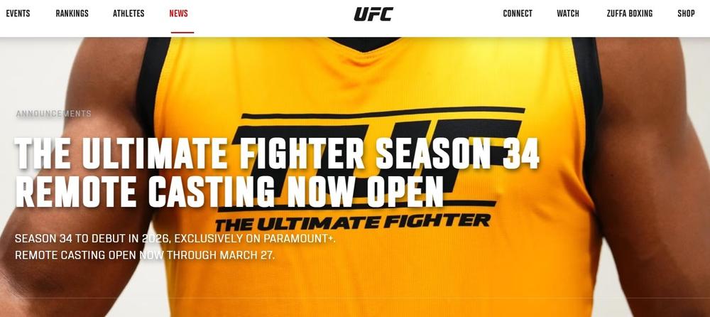 2026年3月2日(日本時間3日)、UFCとParamountは『THE ULTIMATE FIGHTER SEASON 34』(ジ・アルティメット・ファイター=TUF)の配信を発表。これは Paramount+で配信される初のTUFの新シーズンとなる。