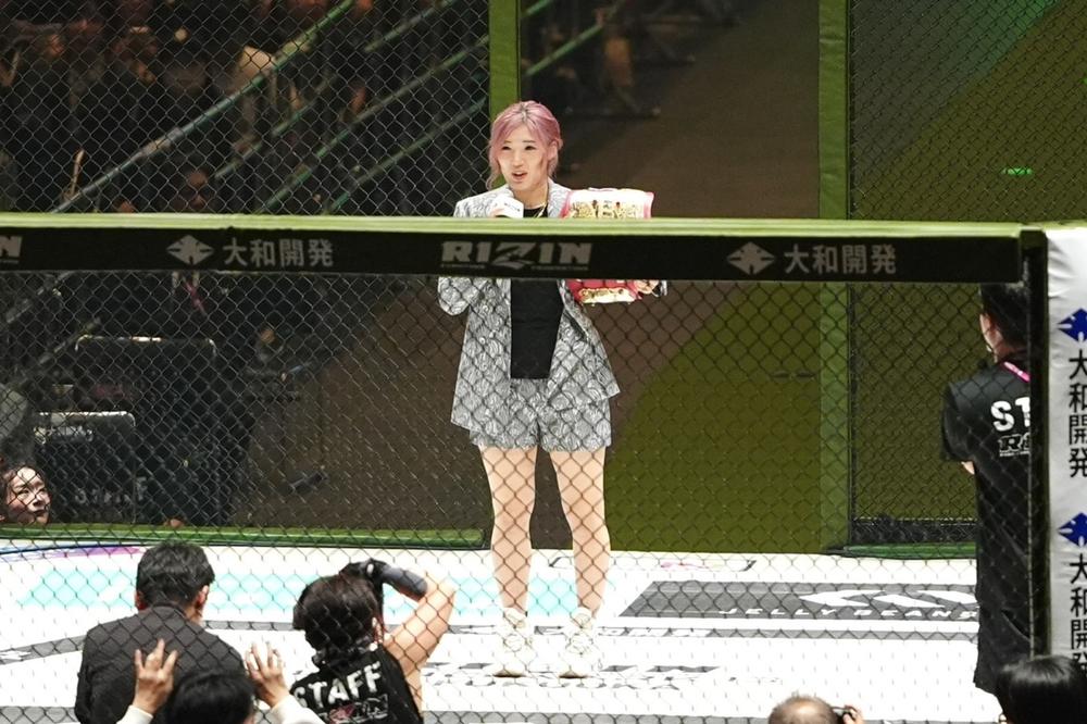 「このたび、COROさんとの間に新しい命を授かることが出来ました。なのでこのRIZINスーパーアトム級のベルトを一度返上させていただきます。このベルトと一緒に自分も成長してきたので、この決断