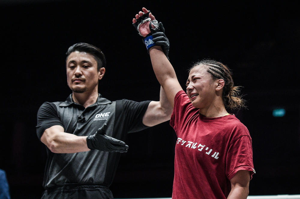 ONEで2連勝中の三浦彩佳(TRIBE TOKYO MMA)は第2試合でマイラ・マザール(ブラジル)と対戦し、2R3分01秒、アメリカーナ(V1アームロック)で一本勝ち。ONEで3連勝を飾り、タイトル挑戦へ大きく前進した。