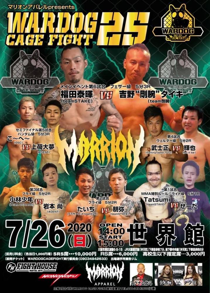 2020年7月26日(日)、大阪市港区の「世界館」にて、「マリオンアパレルpresents WARDOG CAGE FIGHT 25」の開催が決定した。