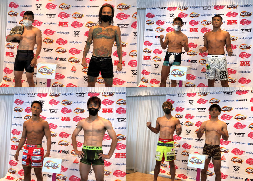2020年8月23日(日)東京・ニューピアホールの夜大会として開催される『skyticket Presents DEEP 96 IMPACT』の前日計量が22日、都内にて行われた。  メインイベントでは「DEEPストロー級(52.2kg)タイトルマッチ」として、王者・越智晴雄(パラエストラ愛媛)が、川原波輝(Team Alpha male)の挑戦を受ける。越智は52.10kg、川原は52.15