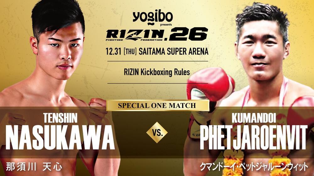 2020年12月31日(木)さいたまスーパーアリーナ『Yogibo presents RIZIN.26』で対戦する、RISE世界フェザー級王者・那須川天心(TARGET/Cygames)vs元WBCムエタイ世界スーパー・バンタム級王者クマンドーイ・ペットジャルーンウィット(タイ)の一戦は、契約体重が調整中となっていたが57.0kgで行われることが決定した(試合時間は3分3Rで延長なし)。