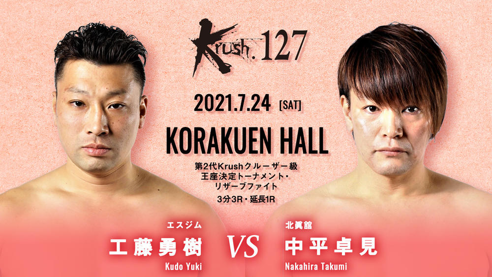 2021年7月24日(土)東京・後楽園ホール『Krush.127』の対戦カードが発表された。  今大会では4選手による「第2代Krushクルーザー級王座決定トーナメント」がワンデーで行われ、初代王者K-Jeeが返上したタイトルを、杉本仁(K-1ジム三軒茶屋シルバーウルフ)、谷川聖哉(K-1 GYM SAGAMI-ONO KREST)、RUI(K-1ジム福岡チームbeginning)、サッタリ・ウ