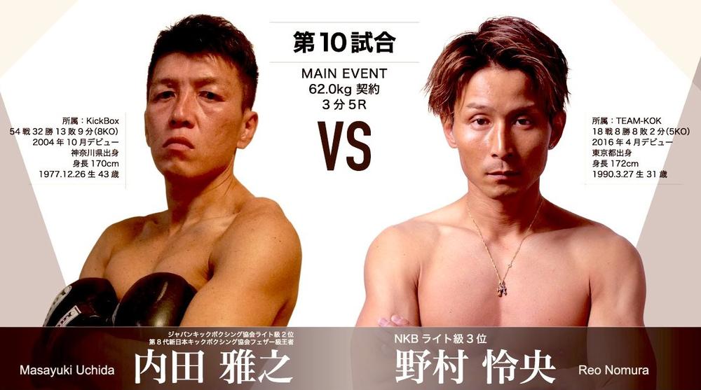 メインイベントは、元新日本キックボクシング協会フェザー級王者・内田雅之(KickBox)をNKBライト級3位・野村怜央(TEAM-KOK)が迎え撃つ一戦。