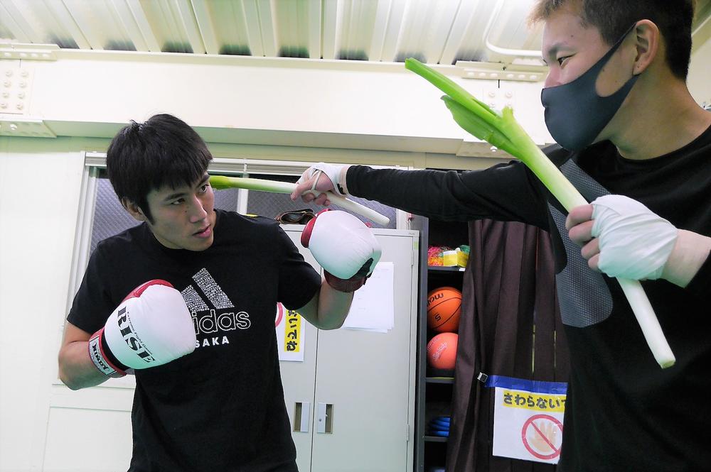 憂也はシャドーを行った後、林裕人代表が持つ“ねぎミット”へパンチを見舞い、ねぎを次々と粉々